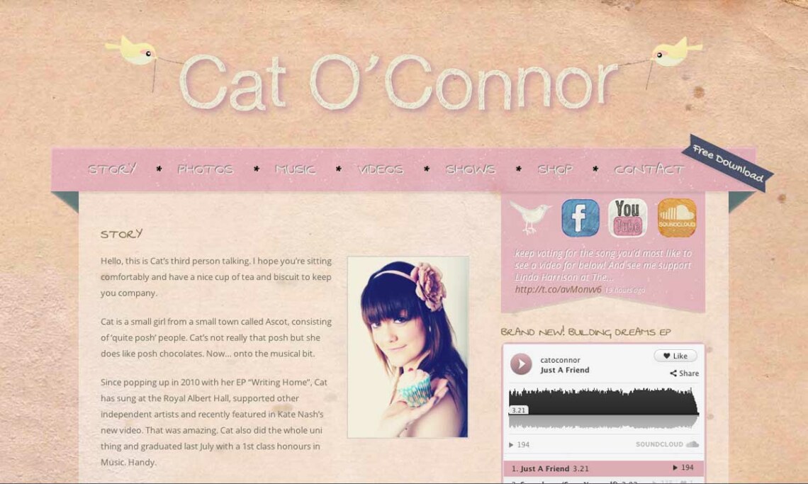 Website Design Cat O’Connor is an up and coming singer/songwriter in need of a new website to inform her growing fan-base of what she’s up to as she tours her new EP – Building Dreams. The Solution [image width=”320″ height=”” align=”left” frame=”blog” url=”http://catoconnor.com”]uploads/2012/11/catoconnorbg.jpg[/image]Powered by WordPress, Cat O’Connors’ site contains of heavy social network integration and uses the built-in wordpress blogging tools to power her news in conjunction with YouTube vlog …