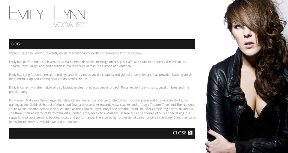 Website Design Emily Lynn is a professional vocalist currently on an international tour with The Australian Pink Floyd Show. The Solution [image width=”320″ height=”” align=”left” frame=”blog” url=”http://emilylynn.co.uk”]uploads/2012/11/emilylynnbg.jpg[/image]A clean and minimal website featuring a responsive layout, jQuery transitions for an elegant experience and powered via social media for updates to appear in real-time. WWW.EMILYLYNN.CO.UK